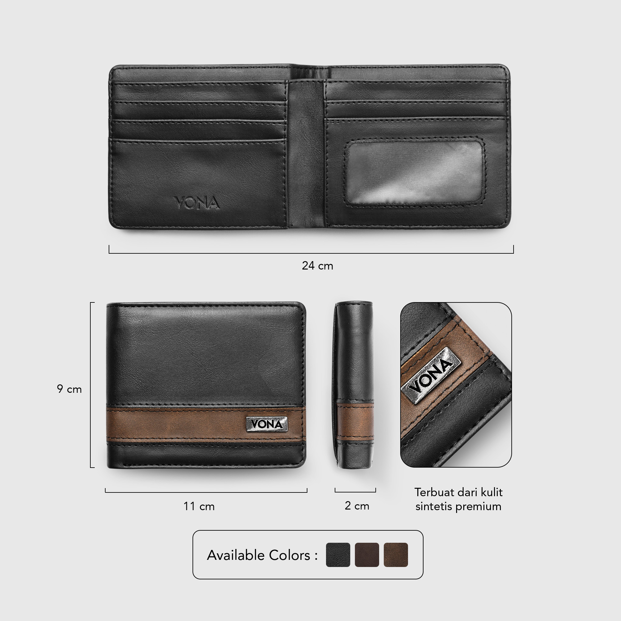 â–º Spesifikasi Bahan: Polos, Kombinasi Warna, Permukaan dompet halus – Memberikan sentuhan mewah dan modern pada tampilan keseluruhan.