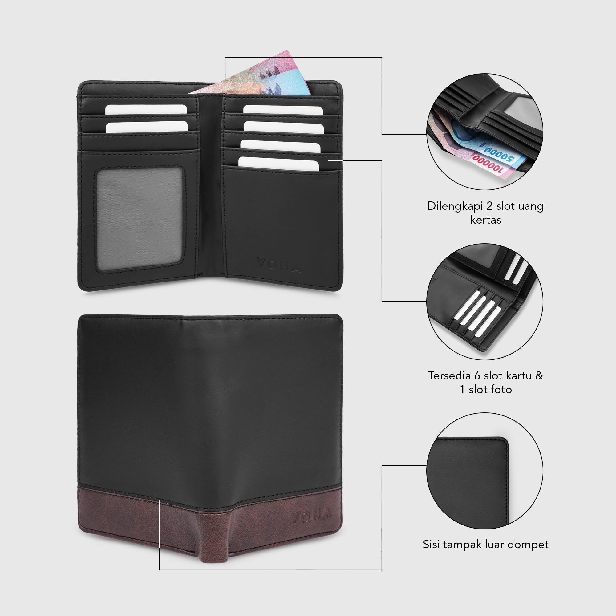 Model : Dompet pendek lipat 2 dengan ukuran 3/4, melebar keatas (vertikal).