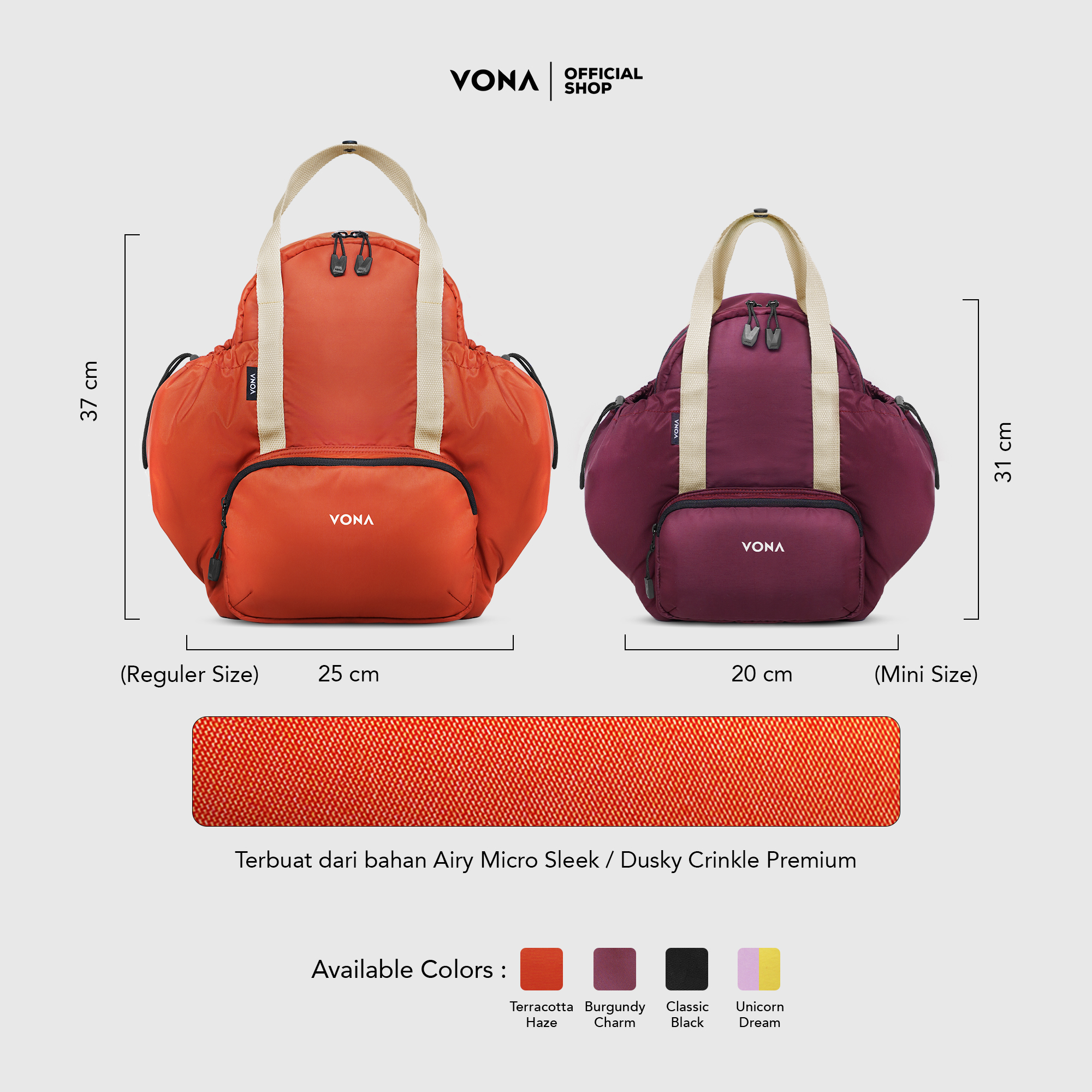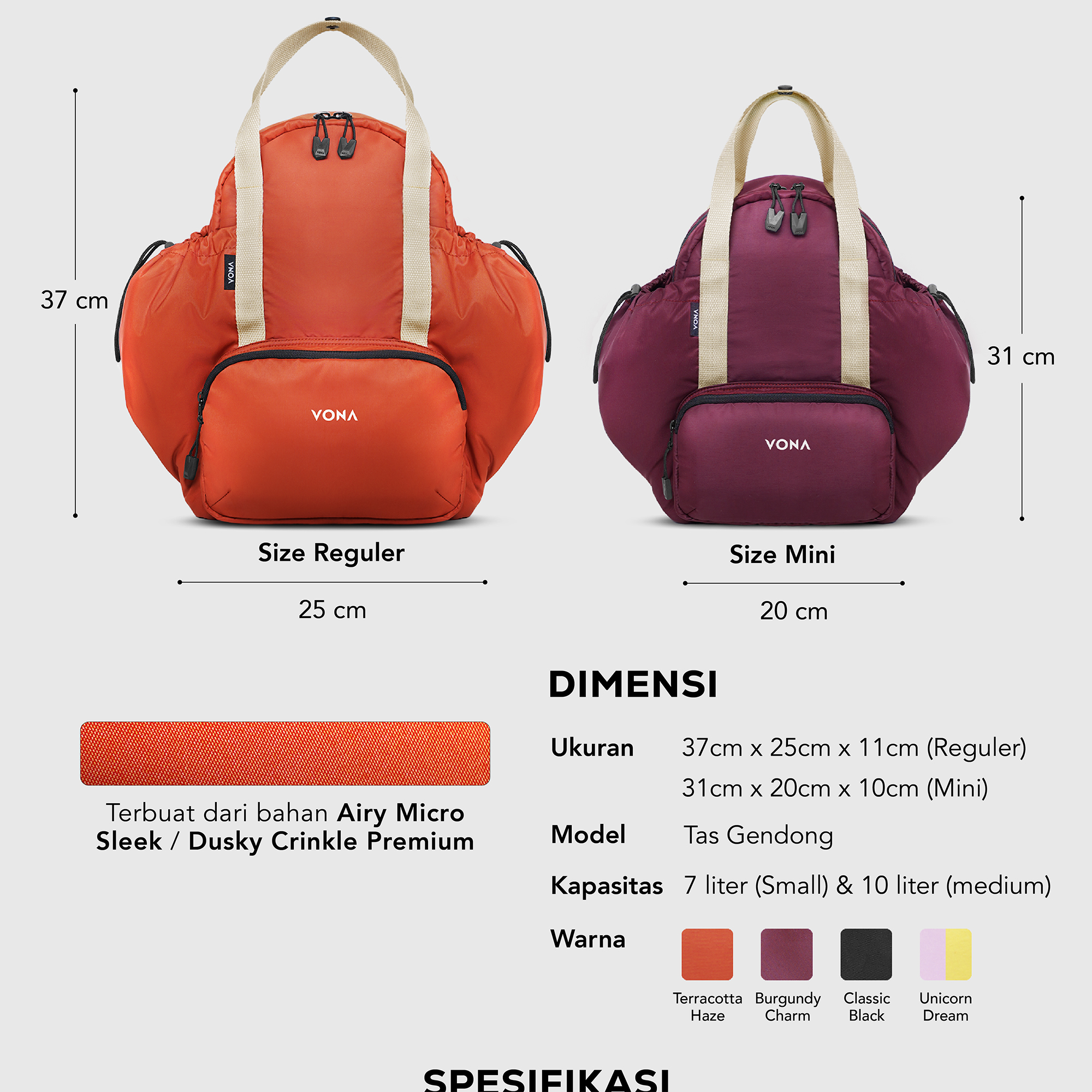 – Dimensi : 37 x 25 x 11 cm (Reguler size) & 31 x 20 x 10 cm (Mini size).