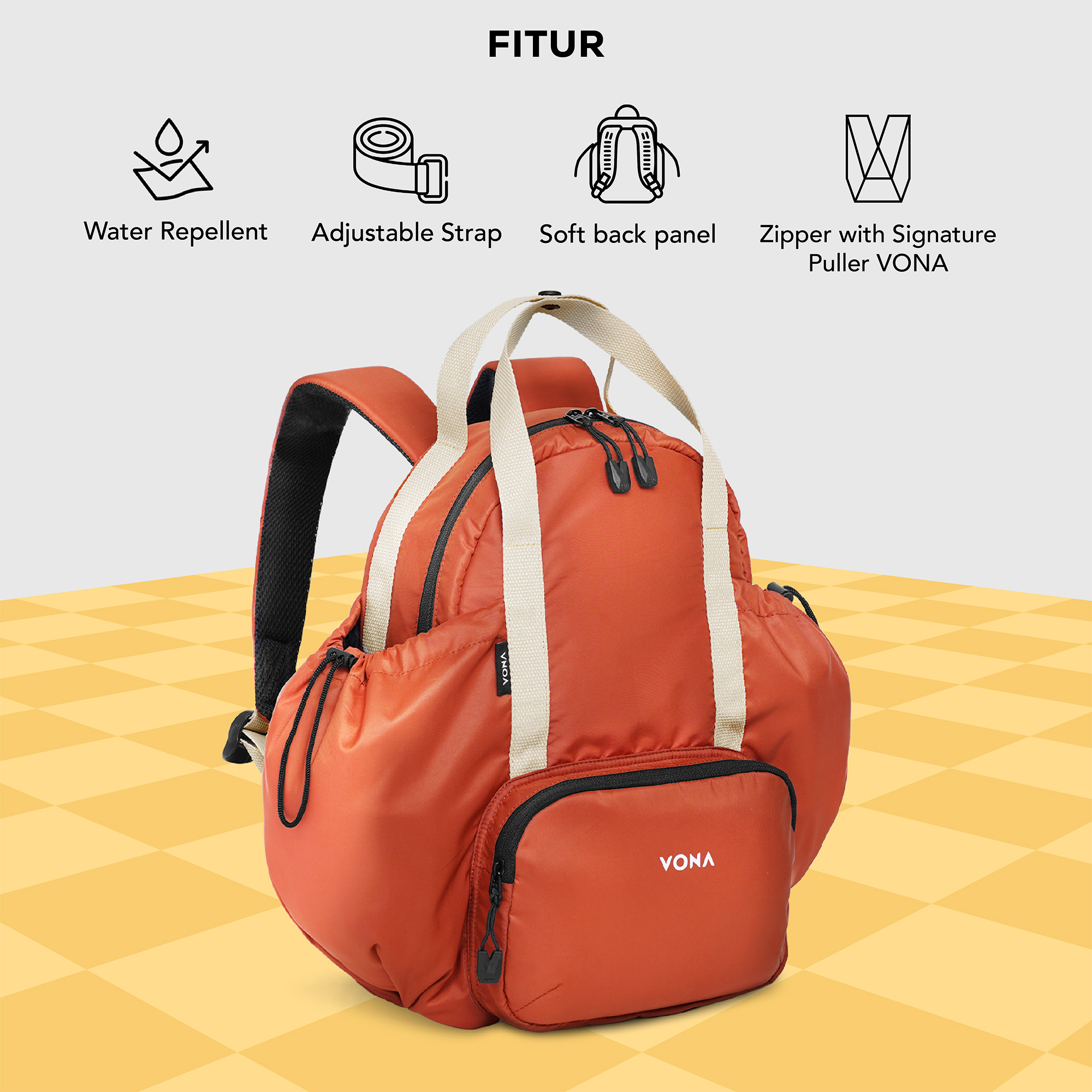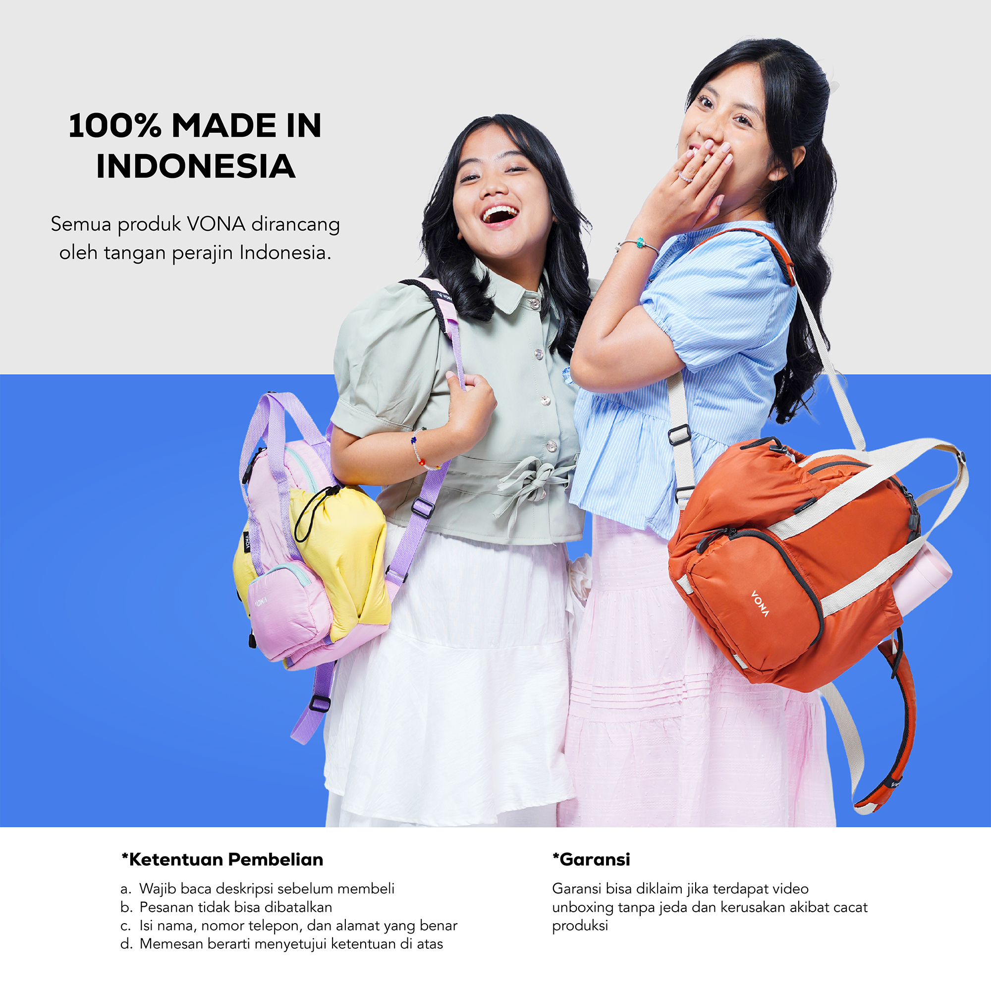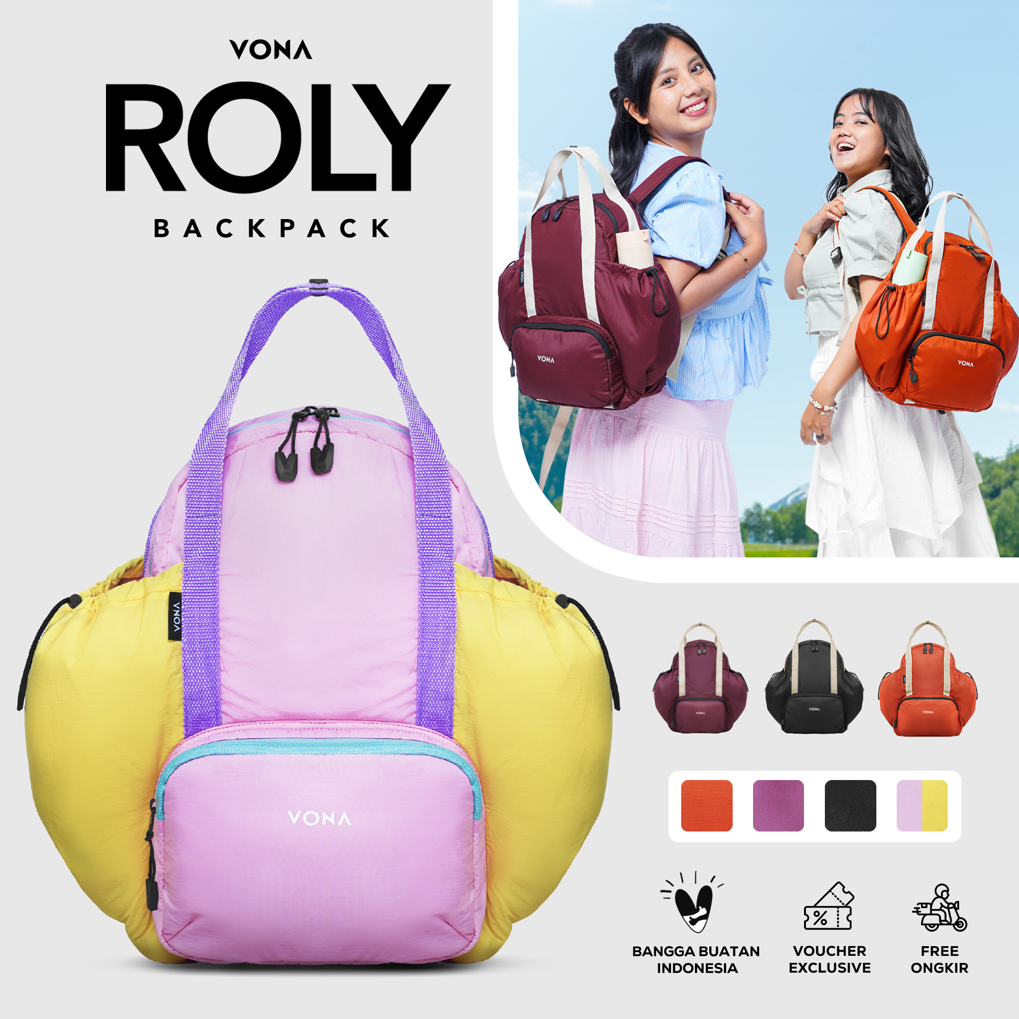 VONA Roly Backpack, ransel puffy gemes yang ringan dan punya slot tumbler, fungsional banget buat menemani aktivitas harianmu dari sekolah, kuliah, hingga hangout. Pssst cocok juga buat hadiah.