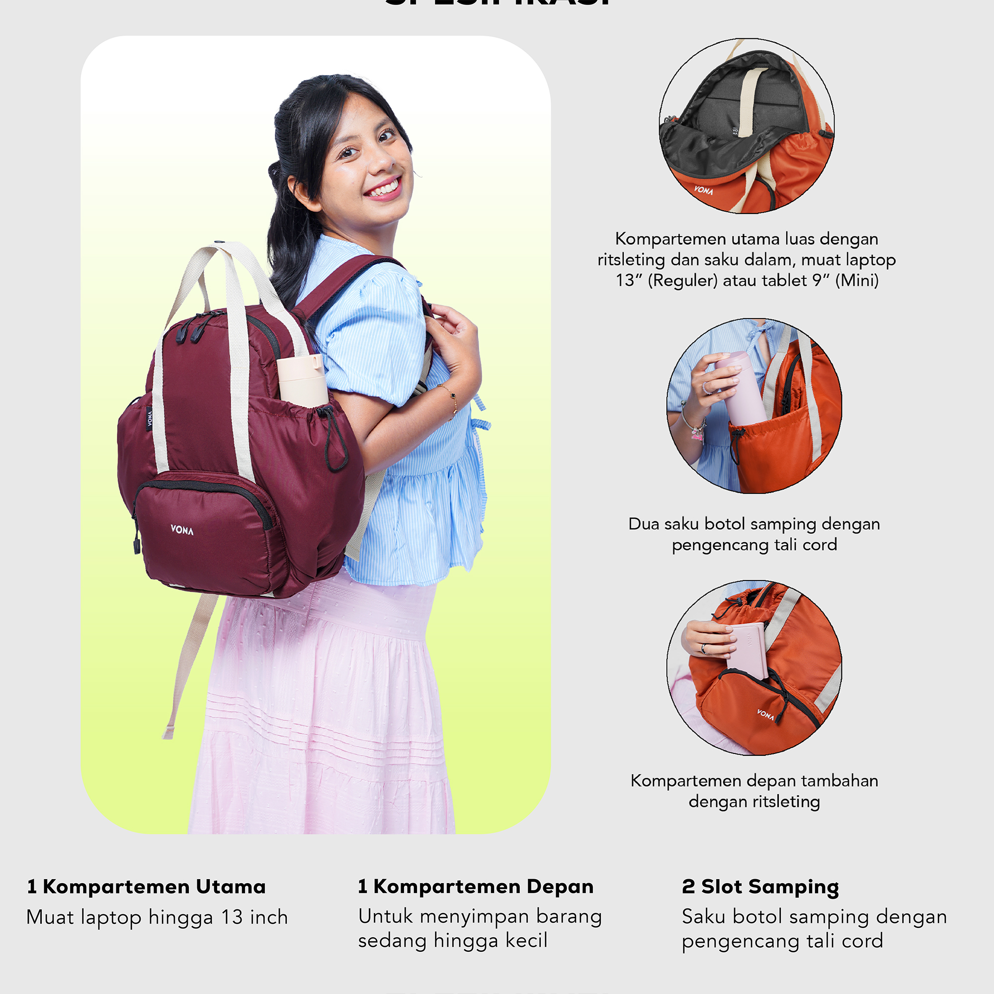 – 1 slot laptop hingga 13 inch (Reguler size) / 1 slot tablet hingga 9 inch (Mini Size)