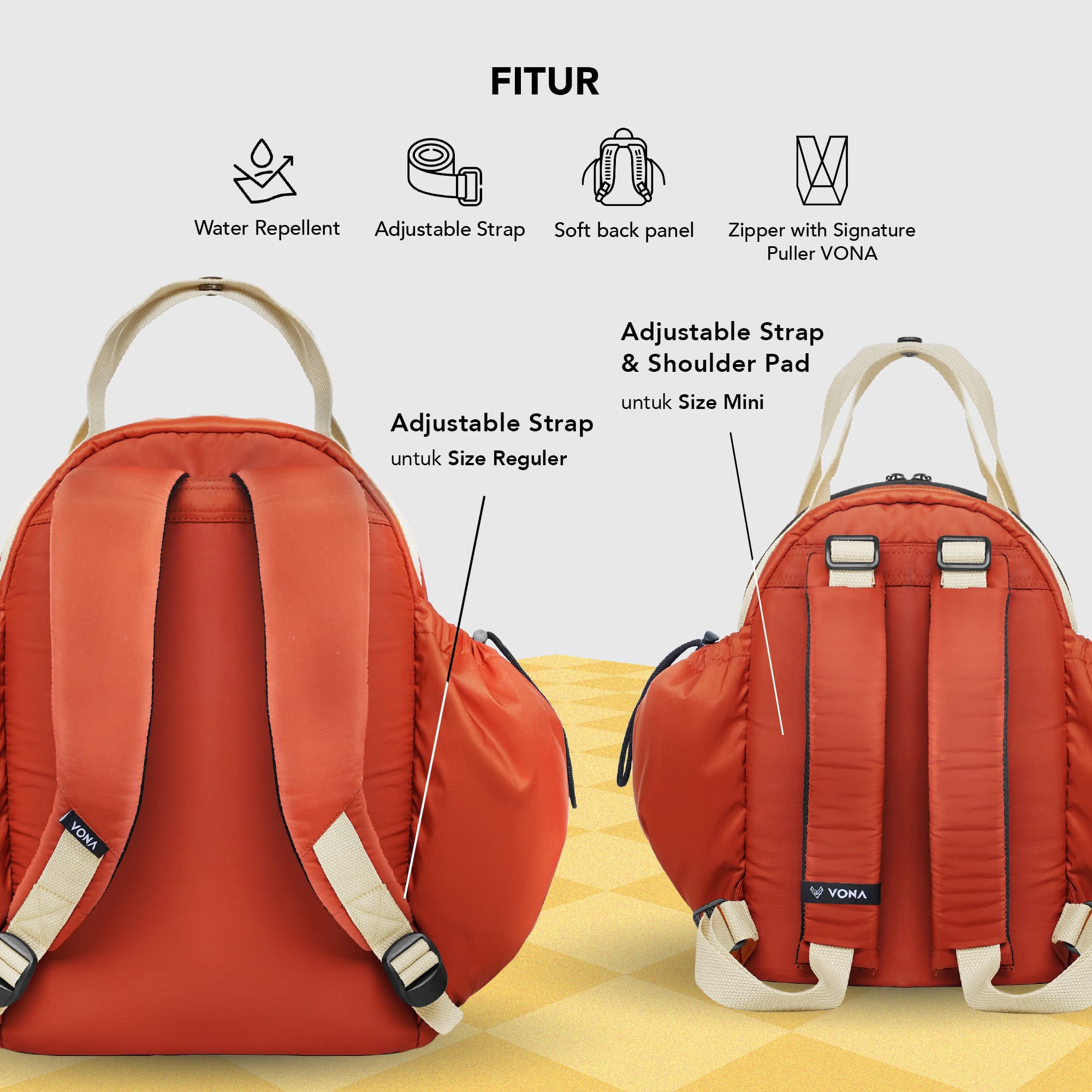 – Adjustable strap (Reguler size) / Adjustable strap & Shoulder pad (Mini size)