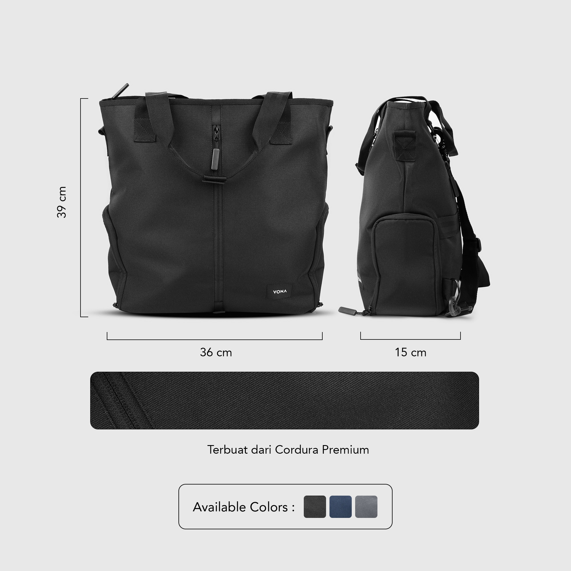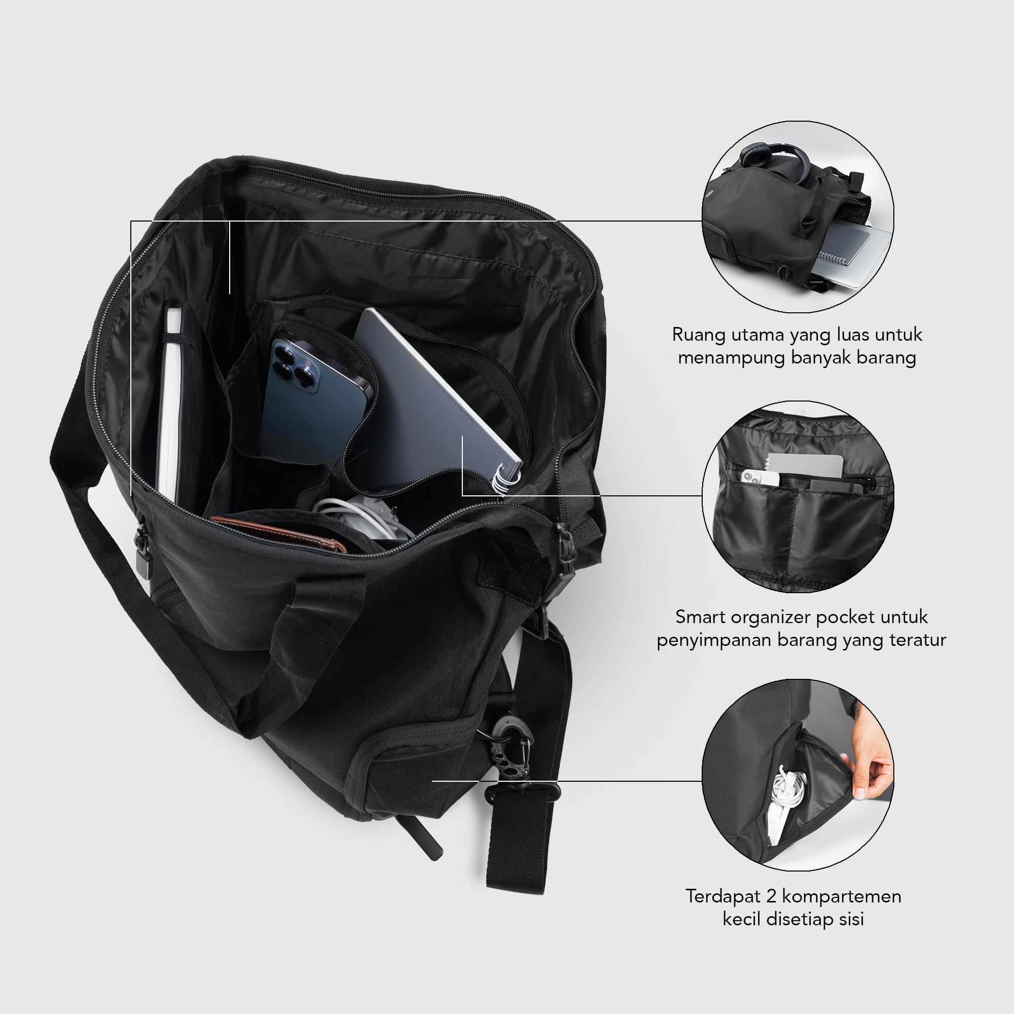 ► 3 mode penggunaan: 3 (Totebag, Backpack, dan Slingbag).